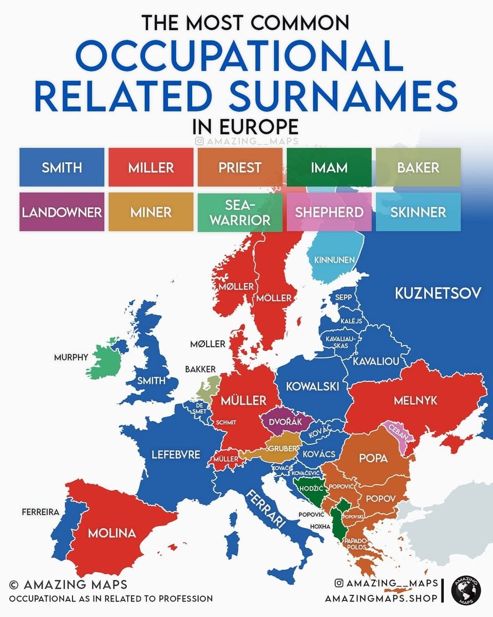 Она на первом месте в России, Белоруссии, Польше (Ковальски), Литва, Латвии и Эстонии, а также в Италии (Феррари - пер. с итальянского Кузнец), Франции (Лефевр), Португалии (Феррейра), Англии (Смит) Это самая популярная фамилия в Германии (Мюллер), Испании (Молина), Украине (Мельник), Швеции, Норвегии и Дании (Меллер) На третьем месте - Попов (Попа, Пападопулос, Попович) - это Румыния, Болгария, Греция На четвертом месте - Имамов (Ходжич) - Босния и Герцеговина, Албания На пятом месте Пекарь (Baker) На шестом - «Landowner» переводится как землевладелец или помещик, Чехия - Дворжак На седьмом - фамилия Miner переводится с английского как шахтёр или горняк Австрия (Грубер) На восьмом - Sea warrior переводится на русский как "морской воин" или "морской боец" - Ирландия (Мерфи) На девятом - Шеппард или Пастухов, распространено в Молдавии (Чобан) На десятом - Скиннер переводится как «снимающий шкуры» или «шкуродер», распространено в Финляндии (Киннунен)