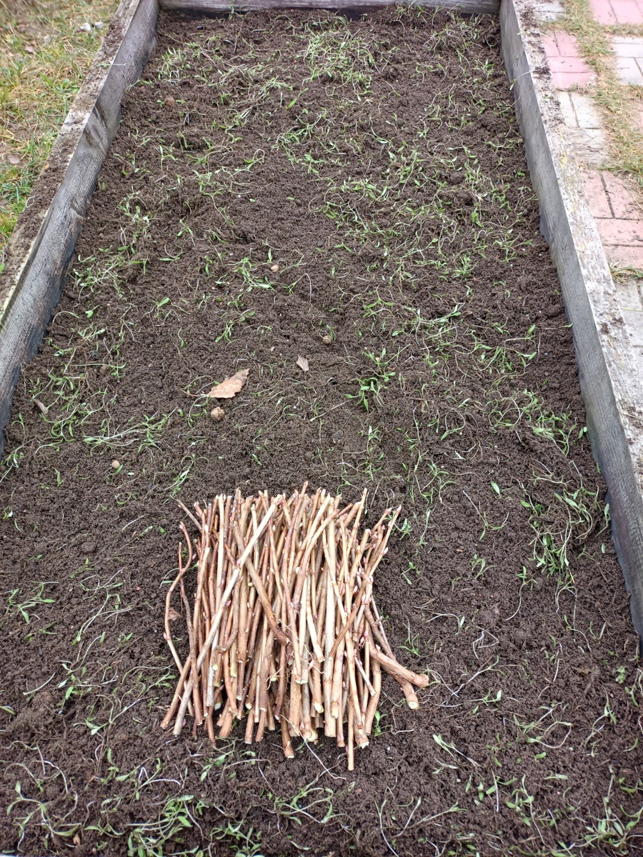 Сантиметров по 25 палочки. Снизу прямой рез, до почки. Сверху косой рез, над почкой.