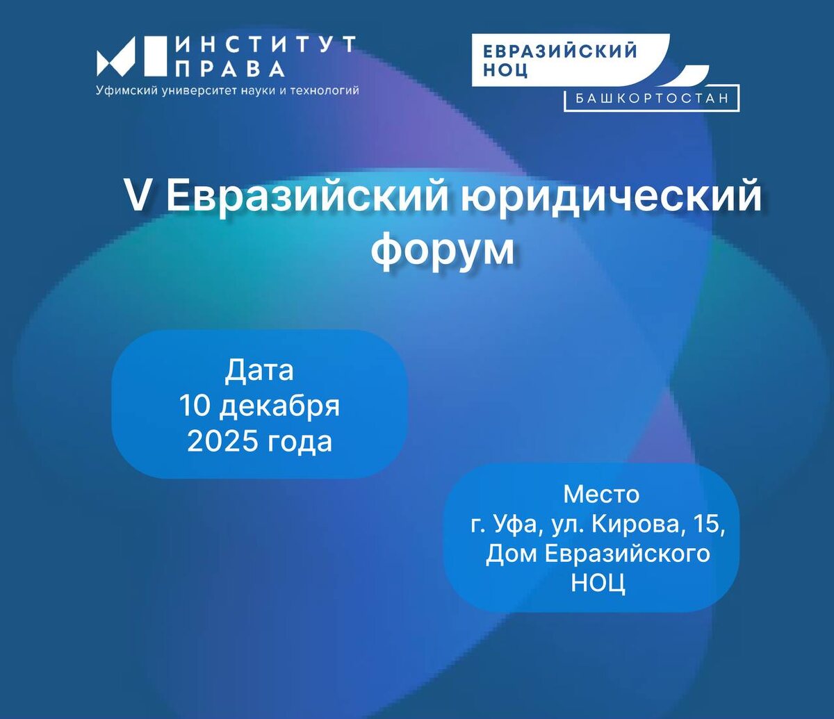 🔹🔹🔹🔹🔹 V Евразийский юридический форум 10 декабря 2025 года 10 декабря 2025 года пройдёт V Евразийский юридический форум, посвящённый одной из ключевых тем современности: влиянию историко-правовых основ национальной идентичности на трансформацию российского законодательства и судебной практики. 🔹 Пленарная дискуссия объединит ведущих юристов, учёных и практиков для конструктивного диалога о балансе между традиционными ценностями и вызовами глобализации. 🔹 В рамках Форума состоятся три научные секции, где будут рассмотрены актуальные вопросы права, идентичности, справедливости и защиты прав человека. 🔹 По итогам мероприятия выйдет сборник статей, включённый в научные базы и индексирующие системы. 🎯 Основная цель Форума - выявить перспективы развития правовых механизмов, способных обеспечить гармоничное развитие общества в условиях современных трансформаций, укрепляя основы справедливого правопорядка и уважение к человеческому достоинству. Научные секции: 1️⃣ Секция 1: Истор