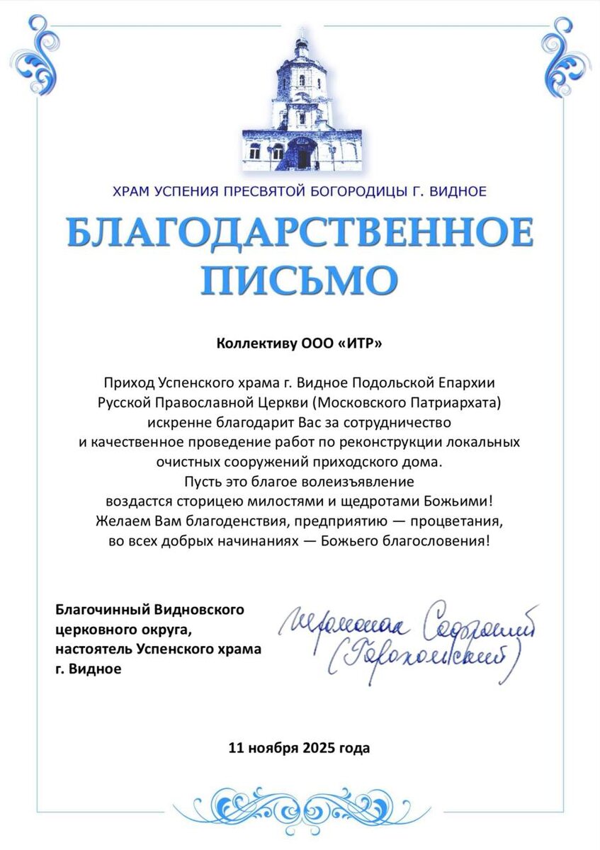 💚 В ИТР ценят каждое проявление доверия! Сегодня хотим поделиться с вами приятным моментом — компания ИТР получила вот такое благодарственное письмо 💌 Иногда самые тёплые отзывы приходят не словами, а делами. Каждая завершённая установка, каждый довольный клиент — это не просто результат работы, а подтверждение того, что мы двигаемся в правильном направлении. Спасибо всем, кто выбирает ИТР 💧 Мы продолжаем делать свою работу качественно, с душой и ответственностью — чтобы у вас дома всегда было чисто, комфортно и надёжно. #ИТР #монтажИТР #отзывыклиентов #доверие #качествоИТР #инженерныесистемы #автономнаяканализация #септикМалахит #компанияИТР