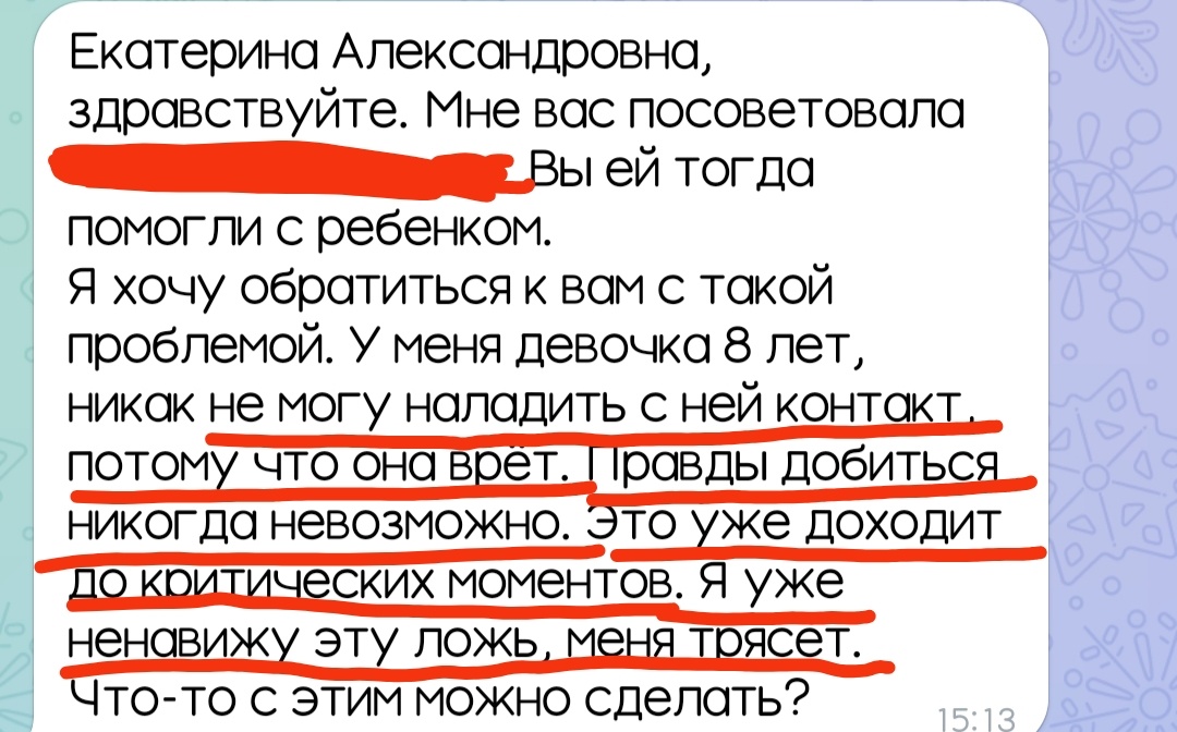 "НИКАК НЕ МОГУ НАЛАДИТЬ С НЕЙ КОНТАКТ, ПОТОМУ ЧТО ОНА ВРЁТ" Все родители на протяжении своей жизни сталкиваются с тем, что их дети могут их обманывать. Кто-то на это реагирует спокойно, кого-то эта ложь выводит из равновесия, а для кого-то это большой удар. Удар потому что потерять доверие ребенка страшно и небезопасно, а вернуть его очень сложно. Немного статистики. 95% до пяти лет хоть раз обманывали своих родителей, но разом там, скорее всего не обходилось. Причем, оказалось, что девчонки обманывают своих родителей намного чаще, чем мальчишки. Но ложь у детей, с точки зрения работы, мозга несёт пользу и является признаком высоко интеллекта. Умение лгать предполагает сложные мыслительные процессы. Чтобы скрыть обман и убедить окружающих в своей версии событий, требуются значительные умственные усилия. Когда ребенок начинает врать, это значит, что он перешел на новый этап умственного развития. Дети до 5 лет чаще всего врут без какого-либо умысла, чаще даже больше фантазирую