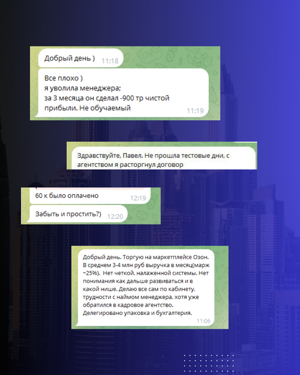 Вы наверняка это знаете. Наняли менеджера, дали доступы, заплатили зарплату... А через месяц — катастрофа. Реклама льется в минус, карточки не оформлены, продажи падают. Владелец снова сам идет в кабинет в 11 вечера и в выходные, чтобы спасти то, что выстраивал годами. Замкнутый круг, который крадет вашу жизнь. Итог один: вы попадаете в ловушку, где невозможно развиваться: Это прямые финансовые потери. Недавно мне собственник рассказывал как обнаружил, что его менеджер за 3 месяца слил 900 000 рублей чистой прибыли! Скриншоты и доказательства этого, к сожалению, реальны. Где менеджер не создает проблемы, а увеличивает прибыль. Где вы тратите на контроль всего пару часов в день и спокойно занимаетесь развитием своего основного продукта. Вот реальный кейс: Наш клиент, владелец швейного производства. Вышел на Wildberries с нуля. Мы настроили процессы и подобрали компетентного менеджера под эту систему. Итог за 2 месяца: Выручка: с 0 до 1,5 млн рублей. Чистая прибыль: 400 000 рублей в ме