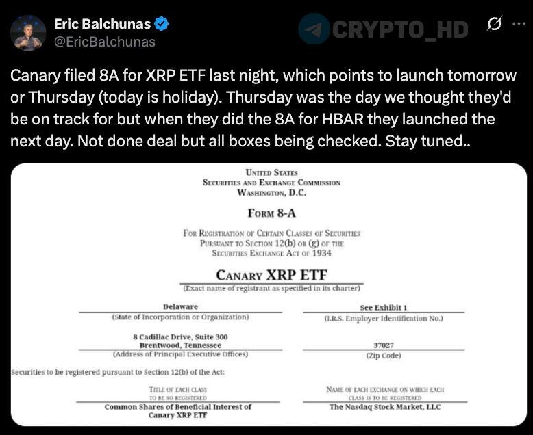 🔥 Запуск спотового ETF на #XRP должен состояться завтра или в четверг – Eric Balchunas Компания Canary Capital подала в SEC форму 8-A вчера вечером – один из финальных шагов перед листингом. Ранее при подаче заявки для Hedera ETF (#HBAR) листинг произошел уже на следующий день – сценарий может повториться, хотя запуск пока не подтвержден. Вероятнее всего: листинг 13 ноября Crypto Headlines