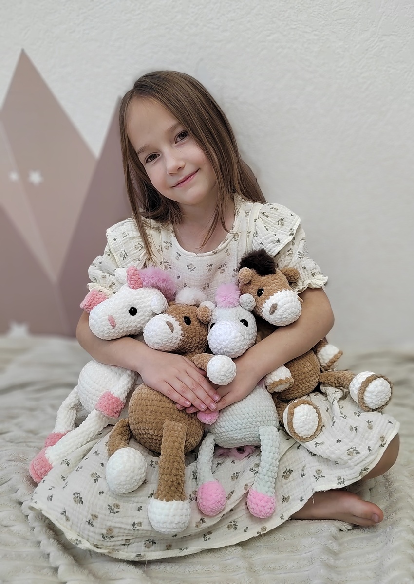 Моя нежная доченька и мои нежные лошадки 🩷😍 Как же они мне нравятся!) Мне, конечно, нравятся все игрушки, которые я вяжу, но эти лошадки прям запали в душу) смотрю на них и умиляюсь: такие они добрые, тискательные, мягкие и обнимательные 💖 А самое главное, что вяжутся они очень быстро 🔥 💫 Ни одной пришивной детали! Ножки, ручки, мордочка и ушки ввязываются в процессе вязания, что облегчает процесс создания игрушки 🔥 💫 Минимальное оформление: вставить глазки, сделать одну утяжку и готово!) 💫 Рост лошадки - сидя 20см, стоя 31см 💫 Расход - 1 моток основного цвета и 20гр дополнительного цвета