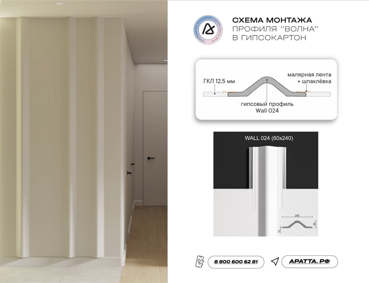 Волны, изгибы, плавные линии… как реализовать тренды в современном ремонте? Использовать наши гипсовые изделия, к примеру, для создания стены с волнами подойдет готовый профиль Wall 024 👀 его можно смонтировать в любом месте перегородки, выполненной из гипсокартона 12,5 мм 👀 предусмотрены фаски для шпаклевки стыков, чтобы получить бесшовную поверхность на стене. При использовании накладного плинтуса вы можете «поставить» профиль на плинтус, либо заказать индивидуальный накладной плинтус по силуэту волны. Если использовать для монтажа теневой плинтус, профиль будет опущен до самого пола. Для заказа индивидуальных изделий обращайтесь @aratta_manager