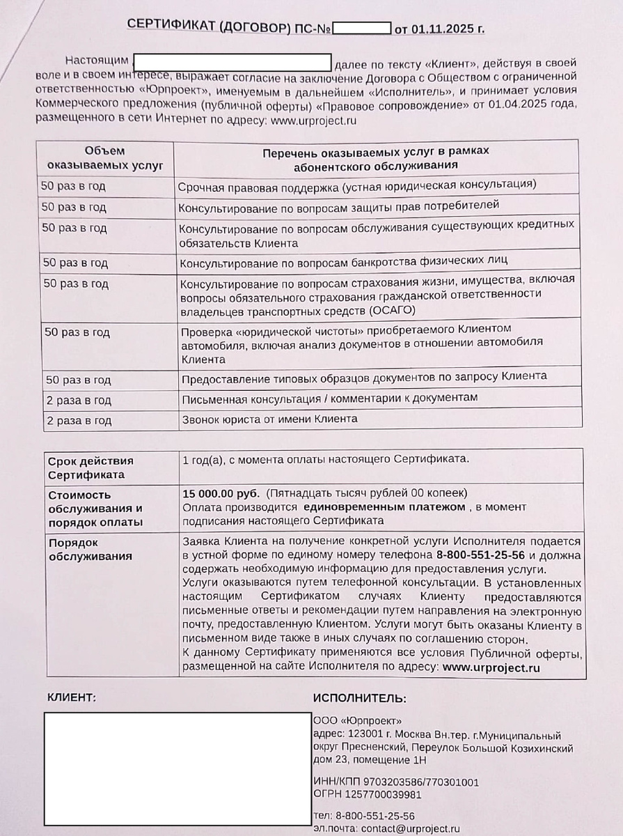 Вернуть деньги за навязанную услугу правовое сопровождение от ООО «Юрпроект»