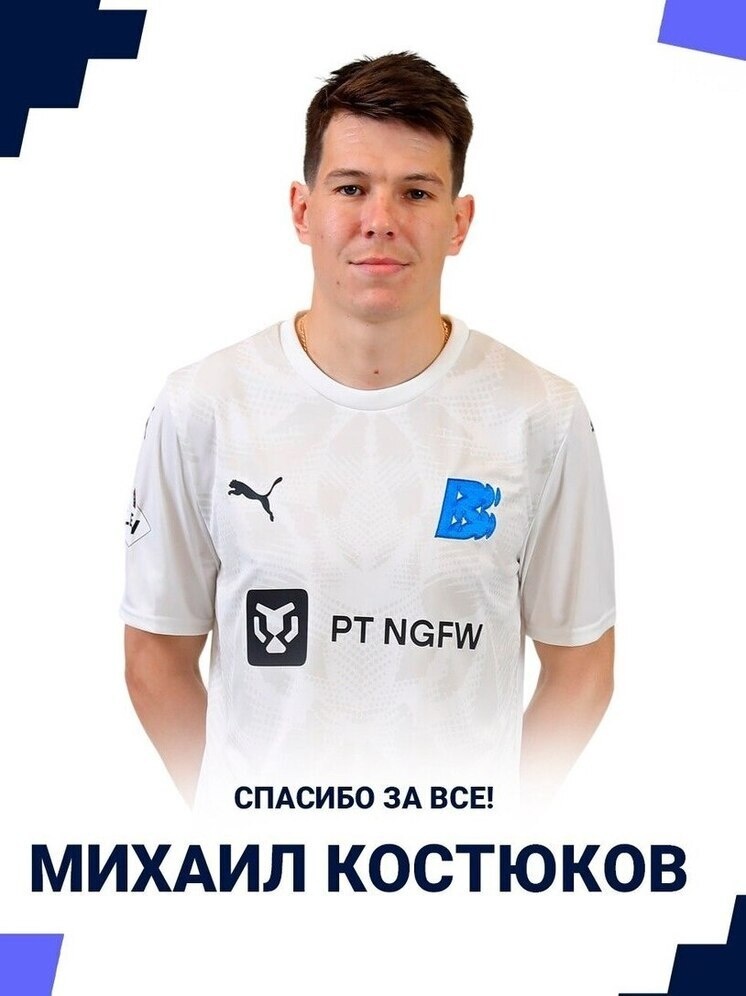 34-х летний полузащитник и нападающий, уроженец Нижнего Новгорода — Михаил Костюков объявил о завершении профессиональной карьеры. Об этом сообщает пресс-служба ФК «Волна», где Костюков провел последний сезон. На счету Михаила Костюкова: 114 матчей в Российской Премьер-Лиге за «Енисей», «Рубин», «Амкар» и др. коллективы, 114 матчей в Первой лиге, 35 голов и 22 голевые передачи, а также игры в квалификации к Лиге Конференций УЕФА.