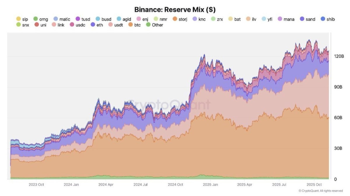 🪙 После недавней волатильности на рынке биржа Binance продемонстрировала неплохую устойчивость — общие резервы платформы восстановились и достигли $120 млрд, всего на 17% ниже исторического максимума в $144 млрд. Мое мнение: Как мы видим, после 10.10.2025 рынок крипты не сломался, а наоборот — выдержал нагрузку и перезагрузился. С рынка убрали излишнее плечо, которое мешало росту, да и часть трейдеров просто вышла из крипты. Теперь будем расти гораздо увереннее — без них.
