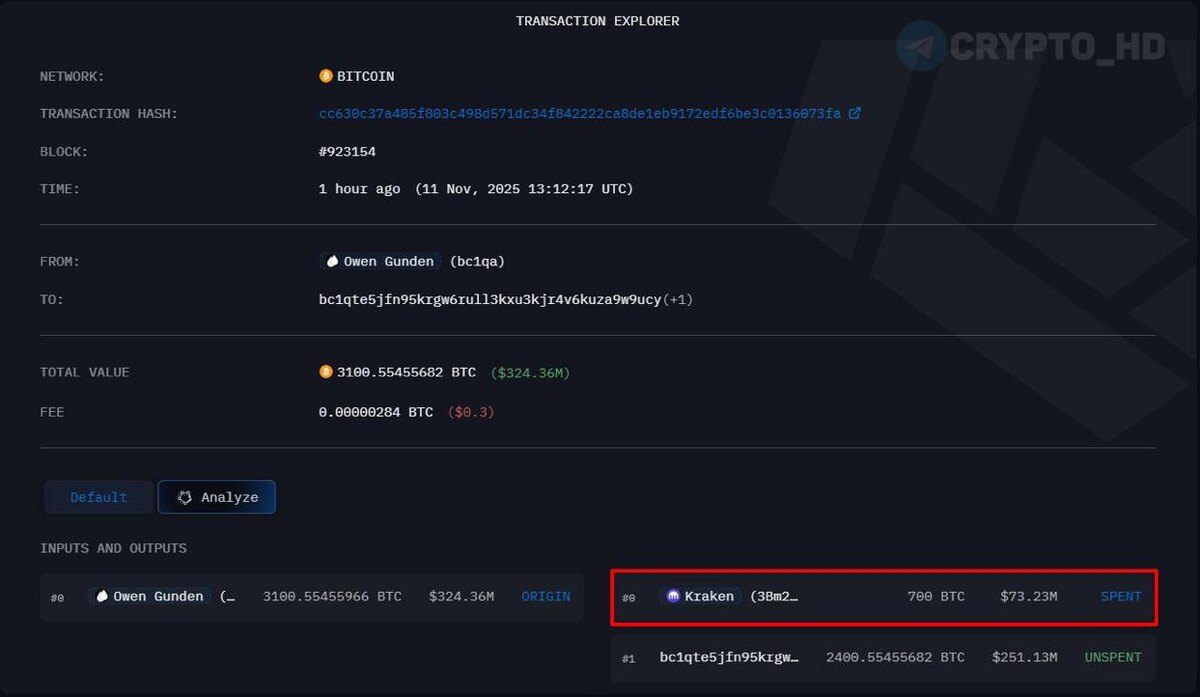 ΠΈ Π‘Π°ΡΠΎΡΠΈ Π±Π΅ΡΠΏΠΎΡΠ°Π΄Π½ΠΎ ΠΏΡΠΎΠ΄Π°Π΅Ρ BTC β arkham ΠΠ΅Π΄Π°Π²Π½ΠΎ Owen Gunden ΠΏΠ΅ΡΠ΅Π²Π΅Π» Π΅ΡΠ΅ 700 BTC ($73,2m) Π½Π° Π±ΠΈΡΠΆΡ Kraken. ΠΠ· 11,000 BTC ($1,1b), ΠΊΠΎΡΠΎΡΡΠ΅ 15 Π»Π΅Ρ Ρ