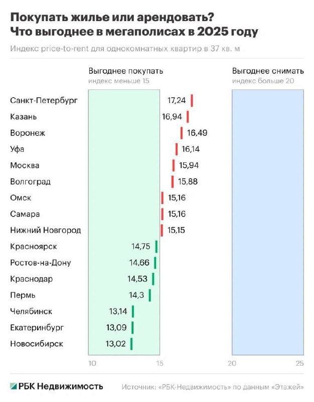 Что выгоднее — снимать или покупать жильё? 🏡 Сегодня хочу поднять вечный вопрос, над которым спорят уже десятилетиями: что же выгоднее — снимать или покупать? Когда я учился в университете, это был где-то 2005 год, мы с однокурсниками постоянно обсуждали этот вопрос. Тогда ипотека в России только начинала развиваться, ставки были высокими, а квартиры уже стоили немало. И большинство сходилось во мнении: зачем брать ипотеку? Проще снимать — ты свободен, не привязан к месту, можешь переехать когда угодно. А ипотека — “кабала” на 20 лет. Прошло 20 лет. И если бы тогда кто-то взял ипотеку даже под те “дикие” проценты, то сегодня он уже давно бы выплатил её — и имел квартиру, которая за это время выросла в цене в разы. А те, кто всё это время снимали, просто платили за чужую недвижимость. 📊 Теперь к цифрам. РБК недавно опубликовали интересное исследование — индекс Price-to-Rent, который показывает, что выгоднее: покупать или снимать жильё. 👉 Если значение индекса меньше 15 — покупат