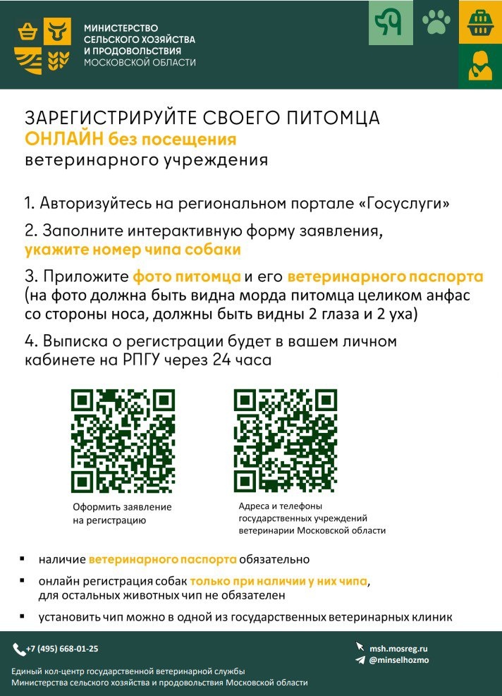 В Подмосковье запущена онлайн-регистрация домашних животных С 25 октября 2025 года в Московской области ввели новый Порядок регистрации домашних животных на территории региона. Изменения позволят регистрировать питомцев без обязательного визита в государственную ветклинику. 🇷🇺Минсельхоз МО сообщает, что теперь вся процедура регистрации проводится дистанционно через Портал государственных и муниципальных услуг Московской области. Зарегистрировать животных теперь могут не только граждане, но и различные организации: питомники, садоводческие товарищества (СНТ), гаражные кооперативы, предприятия и индивидуальные предприниматели. 👉Для оформления потребуется наличие чипа — это обязательное условие для регистрации собак, цифровые фотографии морды животного анфас полностью, тех страниц ветеринарного паспорта, где указаны данные о владельце, сведения о собаке и номер чипа. 👉Затем авторизуйтесь на Портале Госуслуг МО и перейдите в раздел услуги «Регистрация домашних животных», заполн