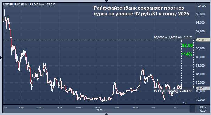 Райффайзенбанк сохраняет прогноз курса на уровне 92 руб./$1 к концу 2025г Курс доллара к рублю расчётный, фьючерс, вечный фьючерс и межбанк. Курс евро к рублю расчётный, фьючерс, вечный фьючерс и межбанк. Курс юаня к рублю биржевой, фьючерс, вечный фьючерс и межбанк. Райффайзенбанк сохраняет прогноз курса валютной пары доллар/рубль на уровне 92 руб./$1 к концу текущего года, сообщается в материале аналитиков. ЦБ опубликовал обзор рисков финансовых рынков за октябрь, обновив информацию по индикаторам спроса и предложения валюты на рынке. "Существенных факторов, которые могли бы объяснить крепость рубля, на наш взгляд, не прибавилось. Улучшение в динамике продаж экспортеров произошло, но они повысились лишь до уровней лета. При этом спрос на валюту со стороны нефинансовых компаний даже вырос, обновив максимумы 2025 года. Каких-либо комментариев относительно участников рынка (поведение которых могло оказать заметное влияние на него) дано не было", - отмечают эксперты. Вопрос аргументов дл