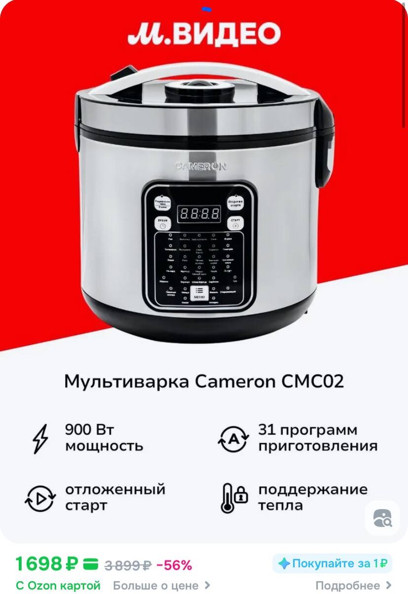 Мультиварка Cameron СMC02, электронное управление, 31 программа, объем чаши 5 литров, 900 Вт https://ozon.ru/t/OM1VNXX Цена на 🛍: 1698 ₽ | 3899 ₽ рейтинг: 5 ⭐️ выгодная цена 💲 ✅ Подписаться 🔣 Бот с промокодами