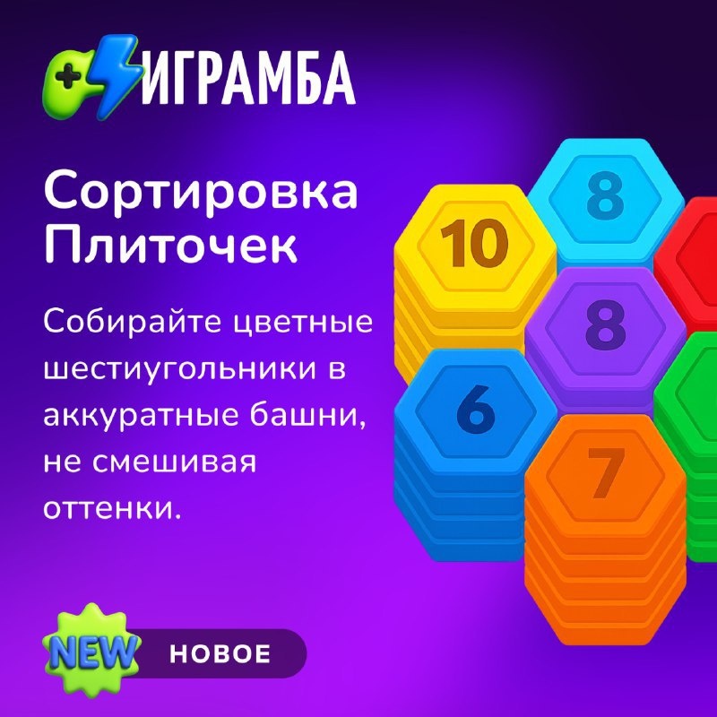 🎨 Упорядочь хаос в мире цветных плиток. Каждый ход — маленькая стратегия: собери башню одного цвета, не ошибись с оттенком и не дай хаосу победить. 🧩 Простая на вид, но затягивающая головоломка — для тех, кто любит спокойствие, точность и чистое удовольствие от порядка. 👉 Играй на Играмбе — тренируй внимание и отдыхай разумно. 🔗 igramba.ru/kazualnye/sortirovka-plitochek