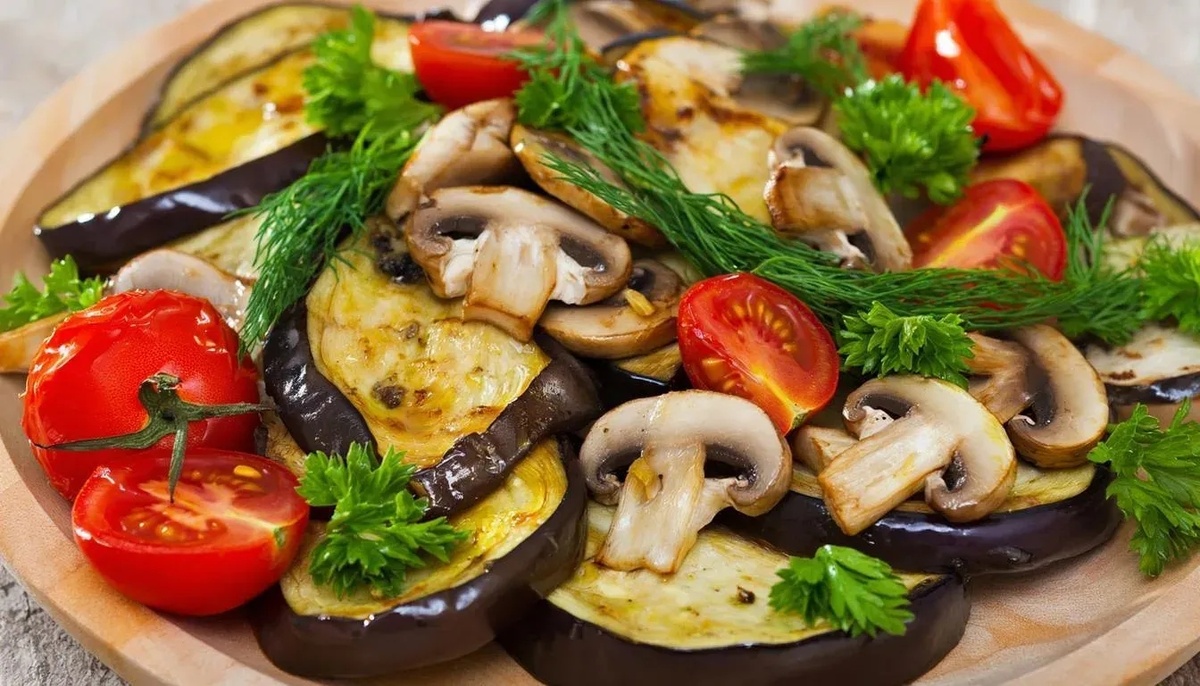 Тёплый салат, грибы с овощами, под соусом с чесноком
