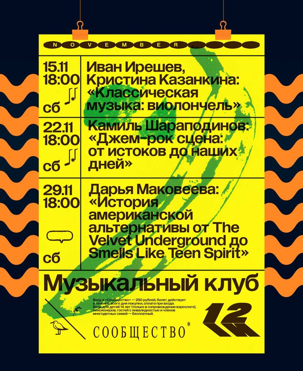 Если вы любите заранее планировать свои выходные, то запишите на ближайшее будущее три новых события нашего Музыкального Клуба, который проходит по субботам в стенах «Сообщества» на острове Новая Голландия. 🗓 15/11 в 18:00 1️⃣ Музклуб Тема: «Классическая музыка: виолончель» — Иван Ирешев (12in team, Haiku Record Store) + специальный гость Кристина Казанкина (виолончель) 🗓️ 22/11 в 18:00 1️⃣ Музклуб Тема: «Джем-рок сцена: от истоков до наших дней» — Камиль Шараподинов (Imagine Club, музыкант, основатель групп The Legendary Flower Punk, The Grand Astoria, Слово Мира) 🗓️ 29/11 в 18:00 2️⃣ Лекция Тема: «История американской альтернативы от The Velvet Underground до «Smells Like Teen Spirit» — Дарья Маковеева (историк, лектор по истории поп-музыки и автор курса «История винила»). • Регистрация не требуется. Вход в «Сообщество» — 250 рублей, билет действует в течение всего дня покупки, оплата при входе.