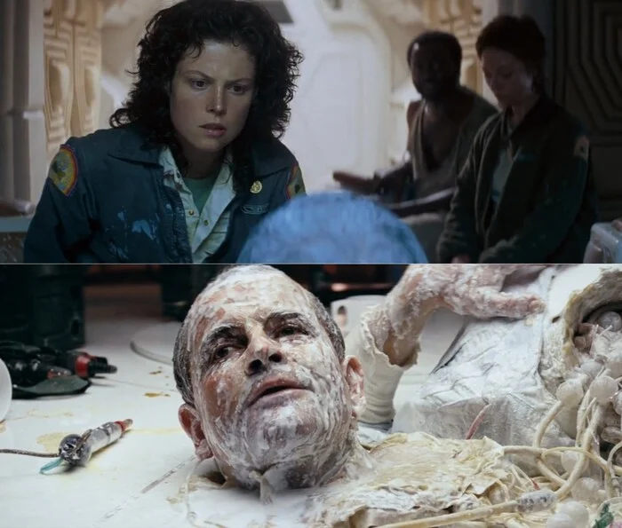 К слову, Эш, как и Кейн, кончает жизнь на столе в столовой — иронично, учитывая, что именно его проступок позволил ксеноморфу дозреть до кондиции.