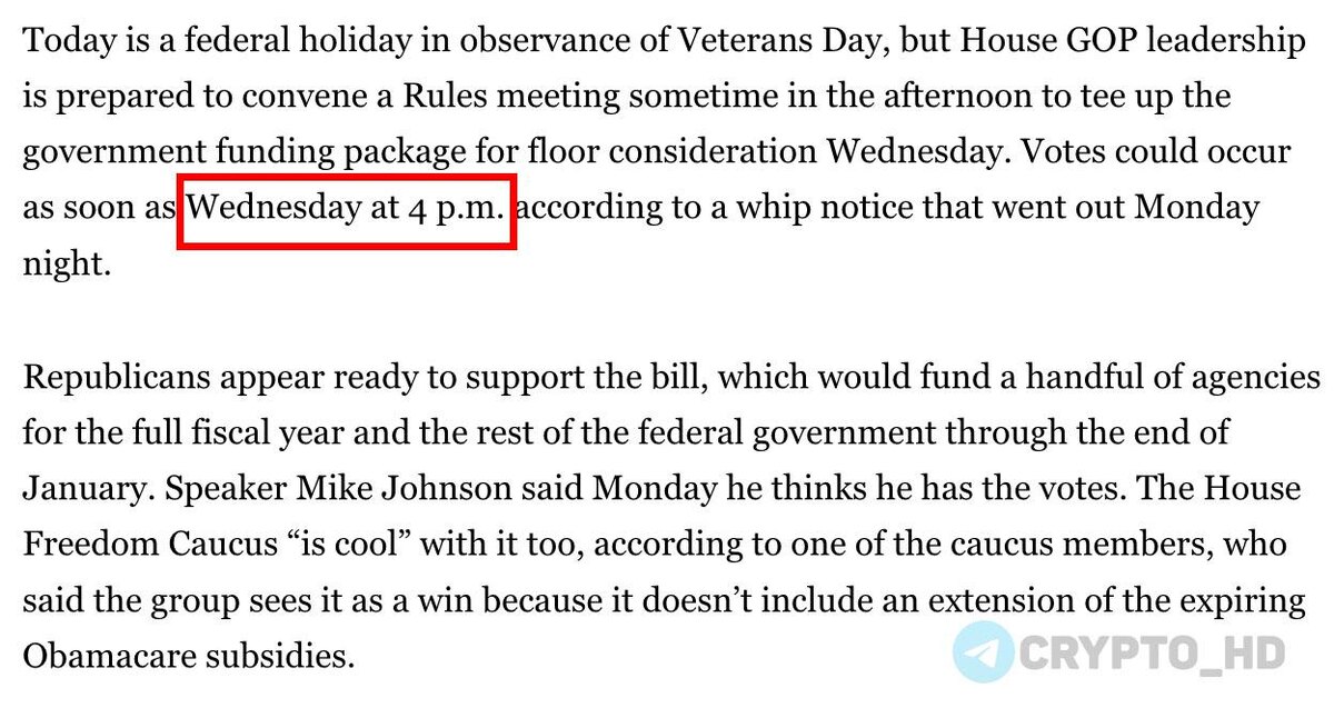 ❗️🇺🇸 Палата представителей США собирается уже завтра провести голосование по законопроекту о временном финансировании правительства – Politico Если Палата представителей примет законопроект → далее документы направят на подпись Дональду Трампу → правительство США сможет возобновить работу уже в четверг. Голосование начнется ночь со среды на четверг в 00:00 мск. Сегодня: Сенат США Crypto Headlines