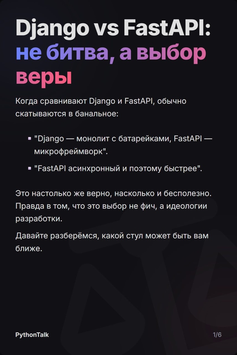 ⚔️ Django vs. FastAPI ⚔️ Выбор фреймворка — это далеко не всегда про скорость, а скорее про архитектурные компромиссы, зрелость экосистемы и требования к команде. Когда что выбирать? Листайте карточки 👉 #два_стула