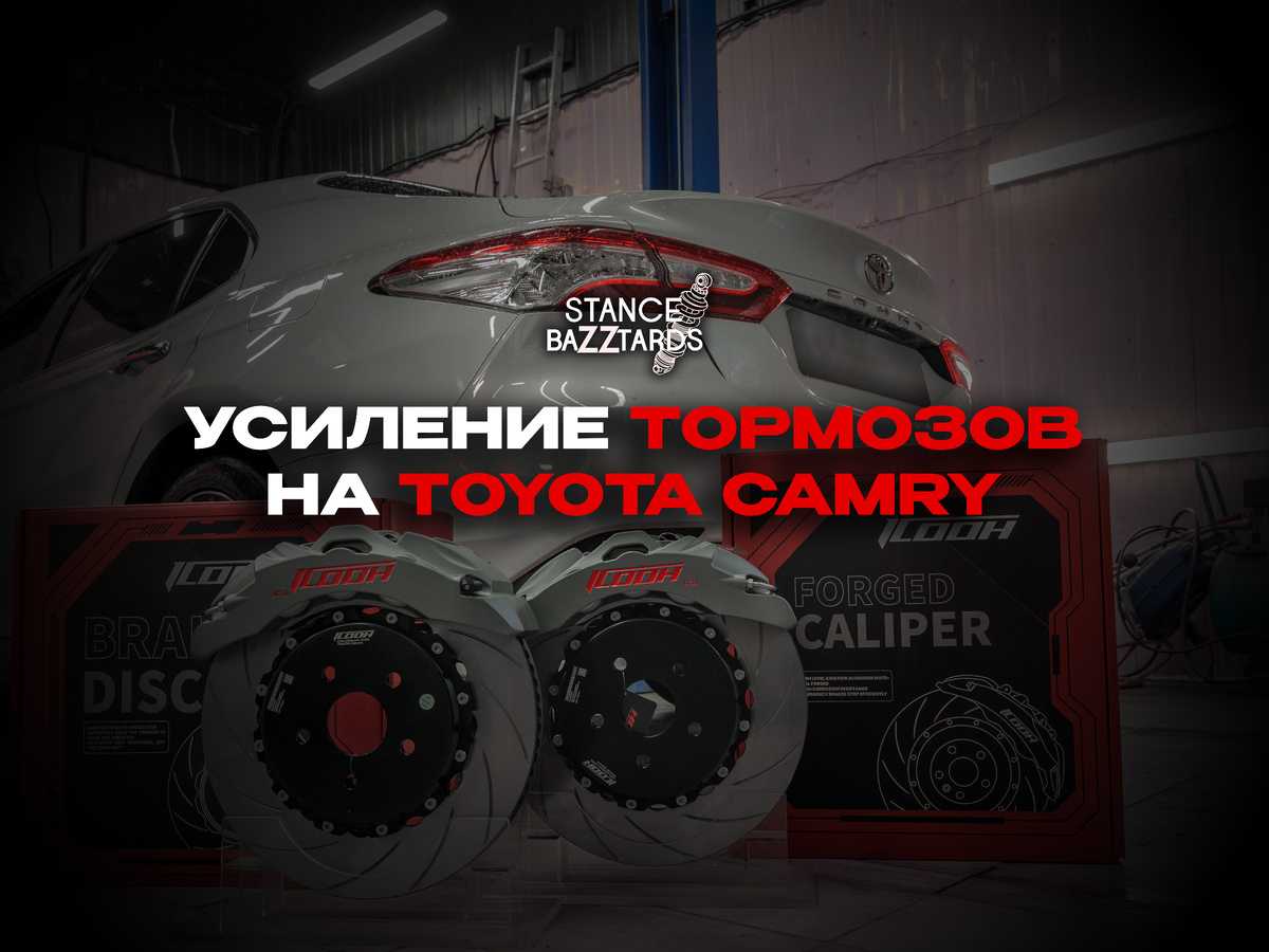 Недавно в наш сервис Stance Bazztards приехала Toyota Camry на установку тормозов ICOOH IC5. Процесс мы показывали вживую в Telegram-канале — от первого болта до финальной проверки. Задача была простая: сделать тормоза эффективнее и надёжнее. Выбор остановили на ICOOH IC5 — комплекте, который подходит для автомобилей с колёсами от 17 дюймов. В него входят: • 6-поршневые суппорта серого цвета, • вентилируемые диски с насечками, • керамические колодки, • армированные шланги. Машину загнали на подъёмник, сняли штатные тормоза, очистили ступицы, проверили зазоры и начали монтаж. После прокачки и проверки герметичности система была готова к первой обкатке. Новые тормоза требуют аккуратного периода притирки — около 1000 км. В это время важно избегать резких и длительных торможений, чтобы колодки и диски правильно притёрлись и сформировали равномерную контактную поверхность. После обкатки тормоза начинают работать в полную силу — с теми преимуществами, ради которых и ставят тюнинг-комплекты: