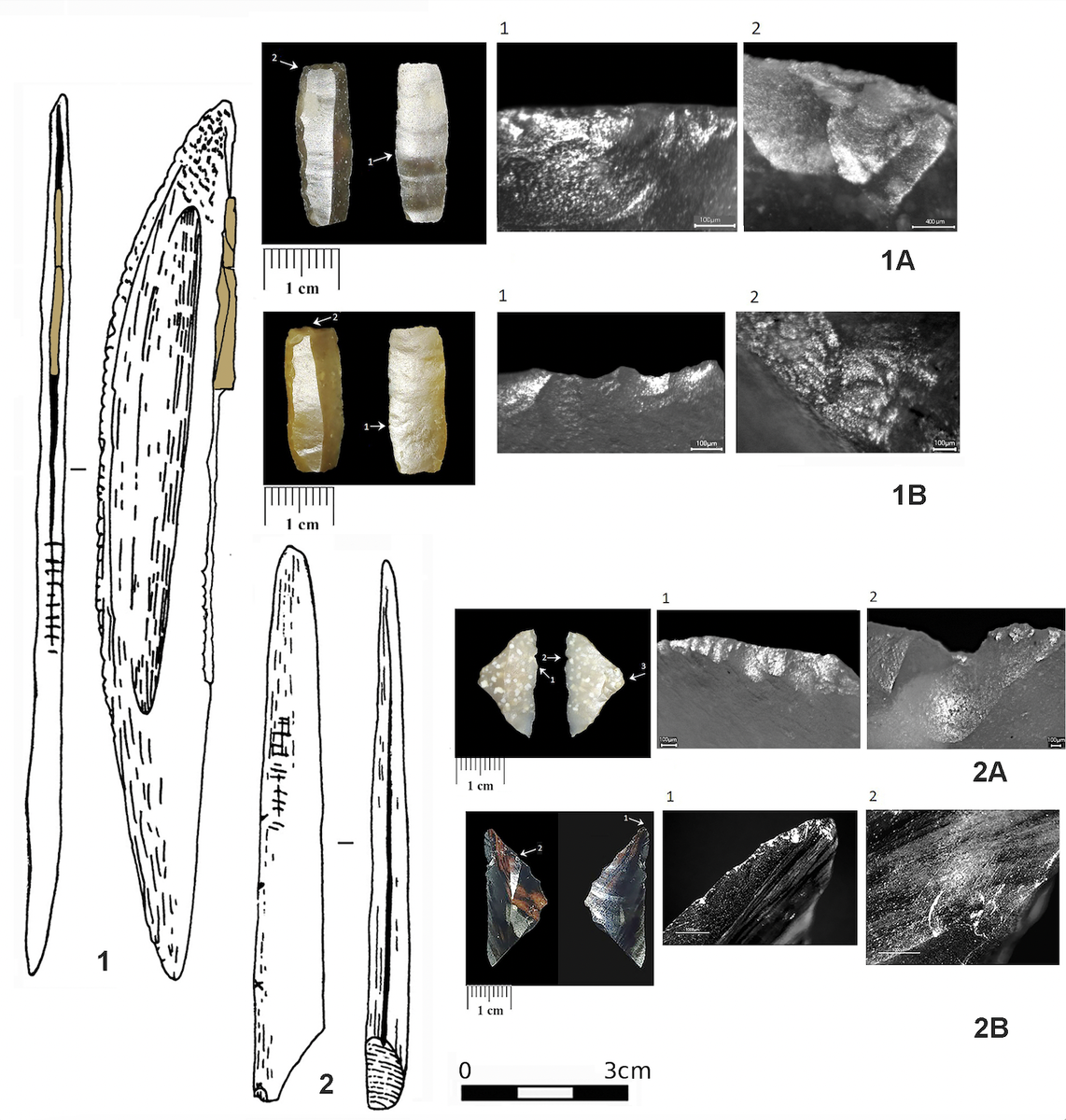 Ученые выяснили, что микролиты — небольшие каменные пластинки — служили не только наконечниками для охотничьего оружия, но и вкладышами для составных ножей, которыми древние жители Кавказа разделывали добычу. Исследование найденных на Северном Кавказе микролитов показало, что в эпоху эпипалеолита — 23–9 тысяч лет назад — охотники создавали универсальные и легко заменяемые модули для сложных бытовых орудий. Эти находки позволяют лучше понять, как развивались технологии обработки камня и изготовления орудий улюдей, населявших территорию нашей страны в древности. Результаты исследования, поддержанного грантом Российского научного фонда (РНФ), опубликованы в журнале Lithic Technology. 1 — Костяной нож из грота Сосруко, 1А и 1В — геометрические микролиты в виде прямоугольников и макрофотографии следов их использования. 2 — фрагмент костяного дротика из грота Сосруко и геометрические микролиты в виде треугольников с макрофотографиями (2А, 2В), которые могли быть боковыми вставками. Источник