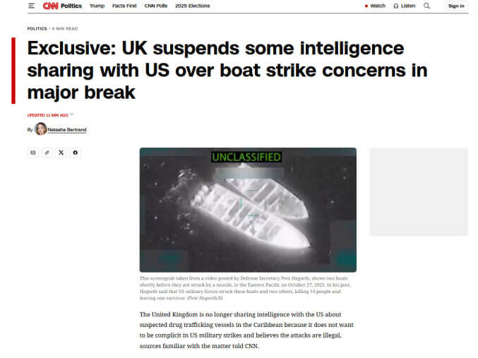 Британия приостановила обмен рядом разведанных с США из-за ударов по судам "наркоторговцев" в Карибском море, сообщил телеканал CNN