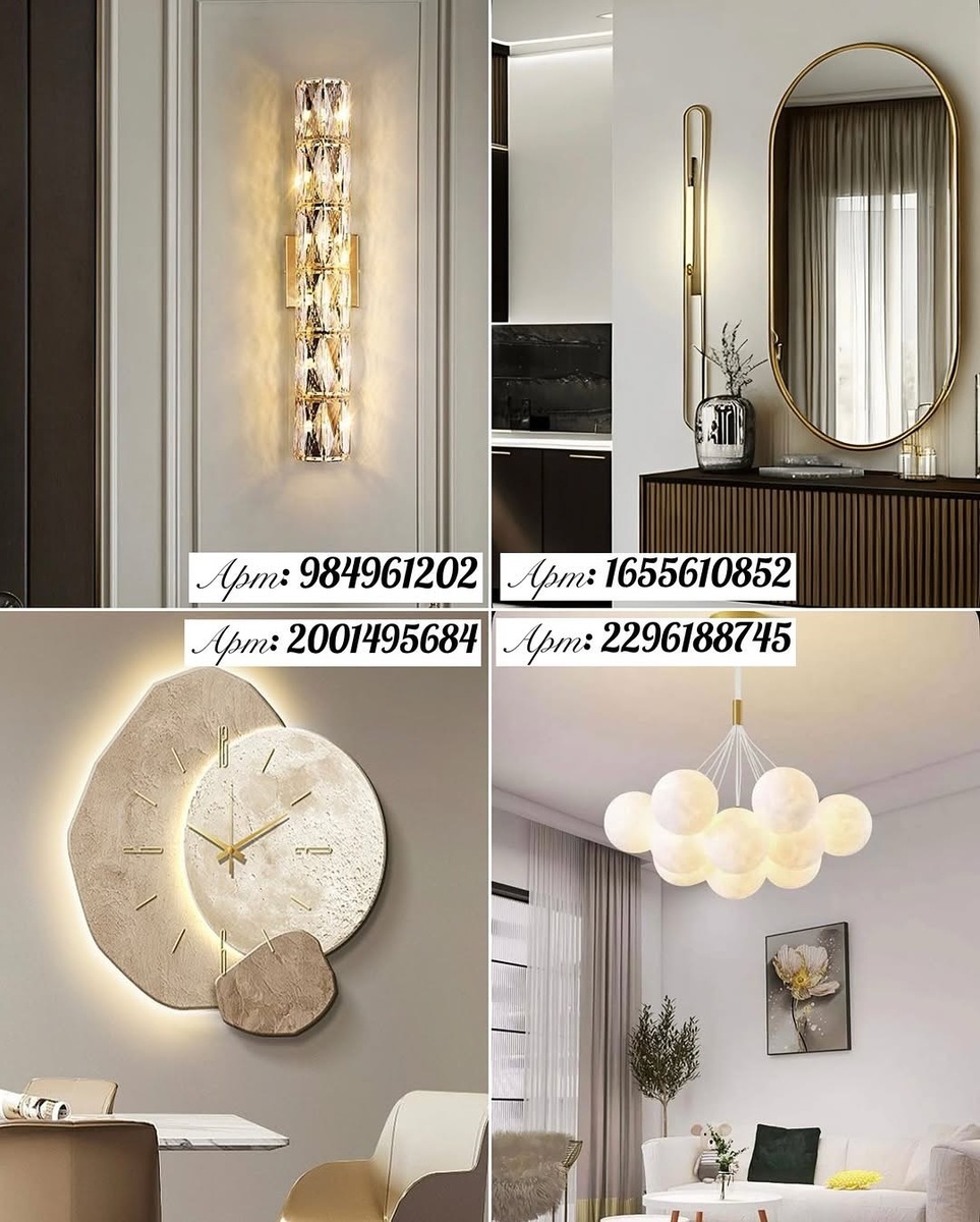 Вертикальные бра и торшер создают многослойное освещение, при котором интерьер становится живым и объёмным. Часы — от каменных композиций до солнечных вспышек — берут на себя роль настенных арт-объектов. Консоль, кресло и комод отвечают за комфорт и порядок, а шторы объединяют всё пространство, мягко обрамляя окно.