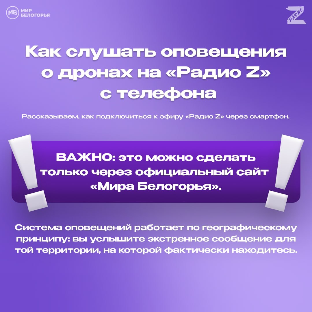 ❗️Как слушать оповещения о дронах на «Радио Z» с телефона Подписчики спрашивают, можно ли следить за информацией о БПЛА, если нет приёмника. В карточках рассказываем, как подключиться к эфиру «Радио Z» «Мира Белогорья» через смартфон⬆️ Подписаться на нас|Прислать новость|MAX