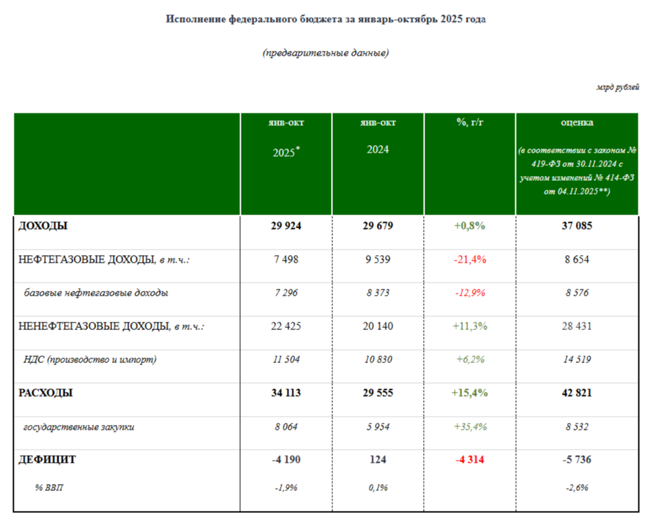 Динамика поступления доходов и финансирования расходов в январе-октябре 2025 года свидетельствует об исполнении федерального бюджета в соответствии с целевыми параметрами структурного дефицита, ожидаемого по итогам 2025 года в соответствии с уточненным законом о бюджете.