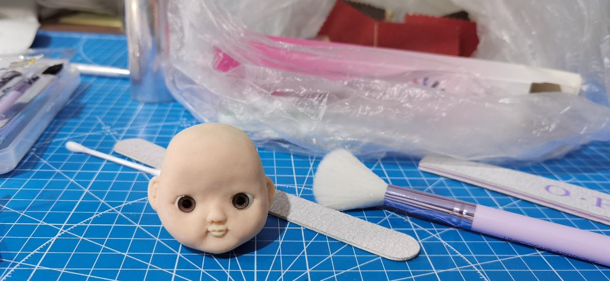На следующий, после монументального начала работы над куклой-обитсу, день я была занята тем, что разными наждачками, губками и пилочками приводила в порядок поверхность запеченной кукольной головы. Заодно доковыряла макетным ножом отверстие для соединения с туловищем. Сначала боялась, что все расколется и пойдет трещинами, но обошлось: пластик потихоньку отскабливался. По ощущениям это было похоже на натирание куска твердого мыла. Подготовив таким образом голову, я приступила к самой интересной и волнующей части марлезонского балета, а именно - созданию собственно лица куклы. Мейк-ап. Как много в этом звуке.... И правда много. Вот что я подготовила: Пастель, акварель, кисти, палитра, а еще в кадр не вошли подставка, карандаши, суперклир, жидкость для снятия лака, ватные палочки и так далее... Дальше покажу этапы процесса, снятые на фото. Ну - поехали! Еще почти ничего не происходит. Немного накидала тончик. Дальше - больше. Сверяясь с книгой, накладывала пастель, постепенно утемняя уч