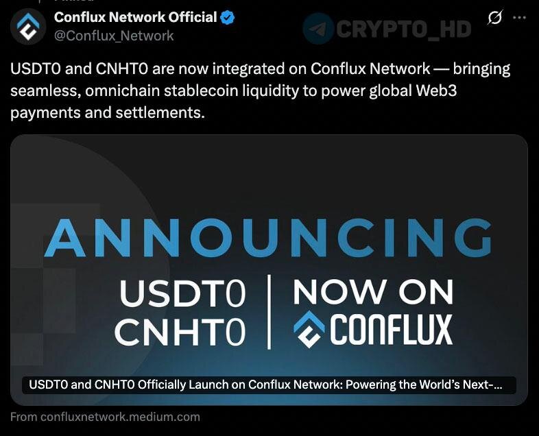 π¬ #CFX Π Conflux Network ΠΎΠ±ΡΡΠ²ΠΈΠ»ΠΈ ΠΎ Π·Π°ΠΏΡΡΠΊΠ΅ ΡΡΠ΅ΠΉΠ±Π»ΠΊΠΎΠΈΠ½ΠΎΠ² USDT0 ΠΈ CNHT0 β ΠΏΠΎΠ΄ΡΠΎΠ±Π½Π΅Π΅