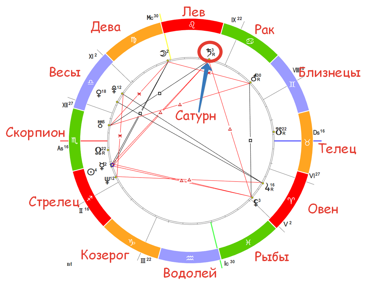 В моем примере Сатурн стоит во Льве. На всякие казявки в виде цифр и буквы R не обращаем внимание. Хотя... с буквой R Сатурн, пожалуй, более вредный будет. Еще более гадко будет проявлять себя Сатурн, который связан с другими планетами черными связями (аспектами).