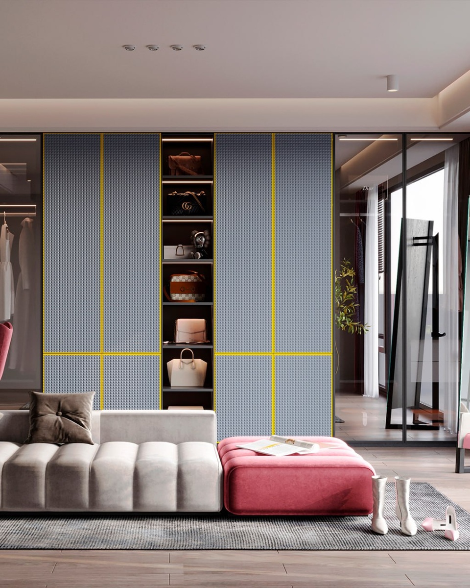 Ловите готовую концепцию гардеробной 20 кв.м от нас! ✨ Иногда клиенты просят: "Придумайте что-то яркое!" и вот что у нас получилось: ✅ Наши новые 3D-фасады RF-PM, как основа стиля ✅ Смелое сочетание серо-голубого, черного и желтого ✅ Розовые акценты для гармонии ✅ Стеновые панели из шпона ✅ Алюминиевые рамки для завершения образа Как вам интерьер? Берете на вооружение? 😉 Всегда на связи для ваших проектов! Ответим на вопросы и поможем с выбором! 📱 Telegram 📱 WhatsApp 📱 Сайт: 3dtema.pro 📲 +7 495 278 08 44 ✉️ info@3dtema.ru