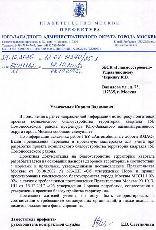 Получил ответы на обращения в адрес Правительства Москвы о благоустройстве в 2026 году ГБУ Автодор ЮЗАО - исполнитель работ по благоустройству ответил: Программа благоустройства находится на стадии формирования, адрес, указанный в обращении, находится в границах квартала, включенного в комплексное благоустройство территорий района Ломоносовский на 2026 год. Управа района - кто собирает предложения - ответила: Указанные в Вашем обращении предложения по благоустройству территории по вышеуказанным адресам направлены проектировщикам для учета в работе при формировании проекта по комплексному благоустройству на 2026 год. Префектура ЮЗАО - над управой, учредитель ГБУ Автодор: Пожелания жителей учтены, но могут быть скорректированы в соответствии с требованием согласующих организаций, а также исходя из лимитов бюджетного финансирования. В каждом письме я приложил результаты опроса из "Электронного Дома" Собянина. Ответы другие, по сути, а не как ранее получил мой житель инвалид получил от