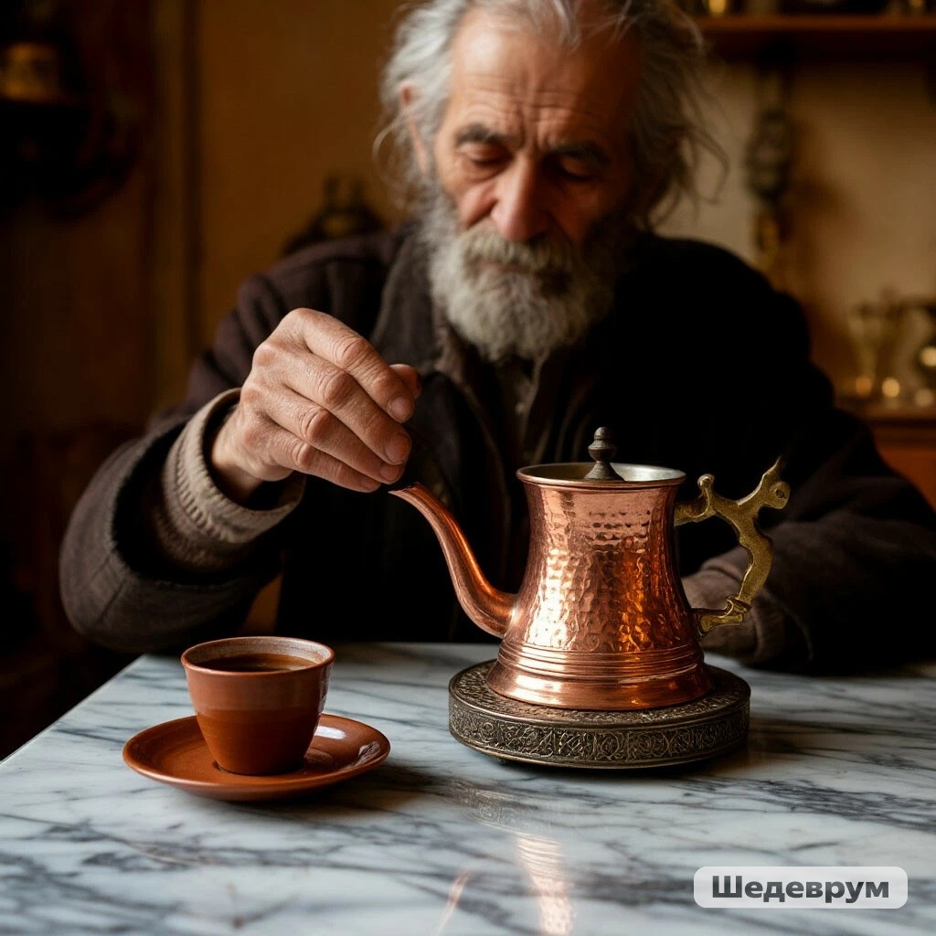На подносе полном раскалённого песка он беспрерывно крутил маленькую медную джезву, то постукивая ей по песку, то двигая и перемешивая, встряхивая не отрывая дна от поверхности. Не нужно было быть ведьмой чтобы понимать: кофе будет вкусный.