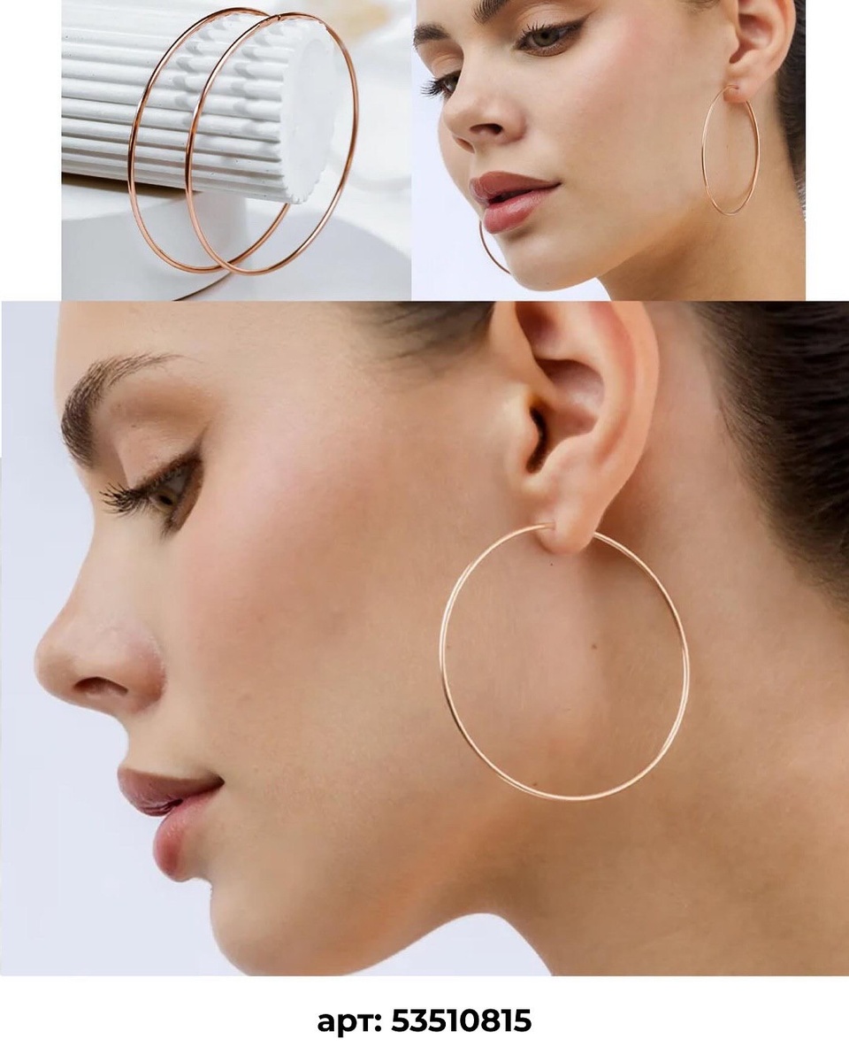 Несмотря на размер, серьги кажутся невесомыми. Тонкая линия не утяжеляет образ, а наоборот, делает его воздушным. На фоне собранных волос кольца создают красивый акцент вокруг лица, а в движении слегка покачиваются, добавляя живости.