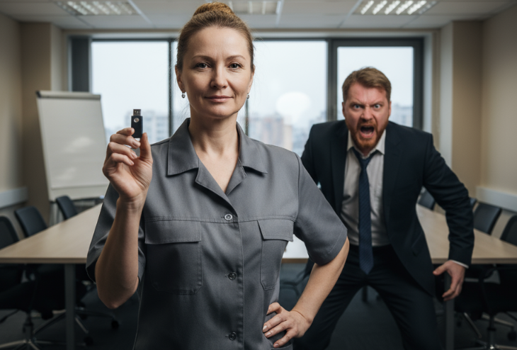 Выждав момент, когда директор ушел на обед (всегда ровно в 13:00, пунктуальность — его единственное достоинство), я быстро скользнула в кабинет с тряпкой и чистящим средством. Охранник на входе уже привык ко мне и только кивнул — мол, делай свое дело.