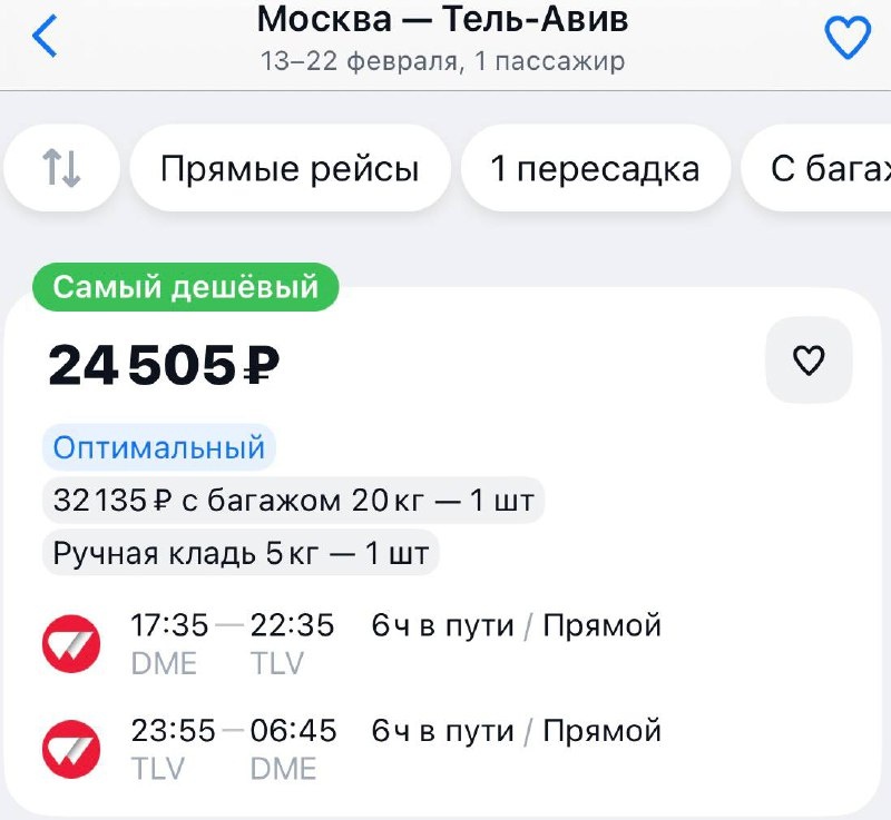 🇮🇱 Москва – Тель-Авив (Израиль): февральское путешествие от 24 505₽ Прямые рейсы на Средиземное море с багажом — успейте забронировать! Даты: 13–22 февраля Цена: от 24 505₽ без багажа / 32 135₽ с багажом 20 кг Рейсы (прямые): ➜ Туда: 17:35 (Домодедово) – 22:35 (Тель-Авив) ➜ Обратно: 23:55 (Тель-Авив) – 06:45 (Домодедово) Время в пути: 6 часов Почему Тель-Авив в феврале? — Мягкая зима: +15...+18°C — комфортно для прогулок — Средиземноморская кухня и архитектура Баухаус — Безвизовый въезд для россиян на 90 дней Совет: — Возьмите ветровку — возможны дожди — Посетите Яффо и набережную #ТельАвив #Израиль #Февраль2025 #TelAviv #Israel @turmexanika