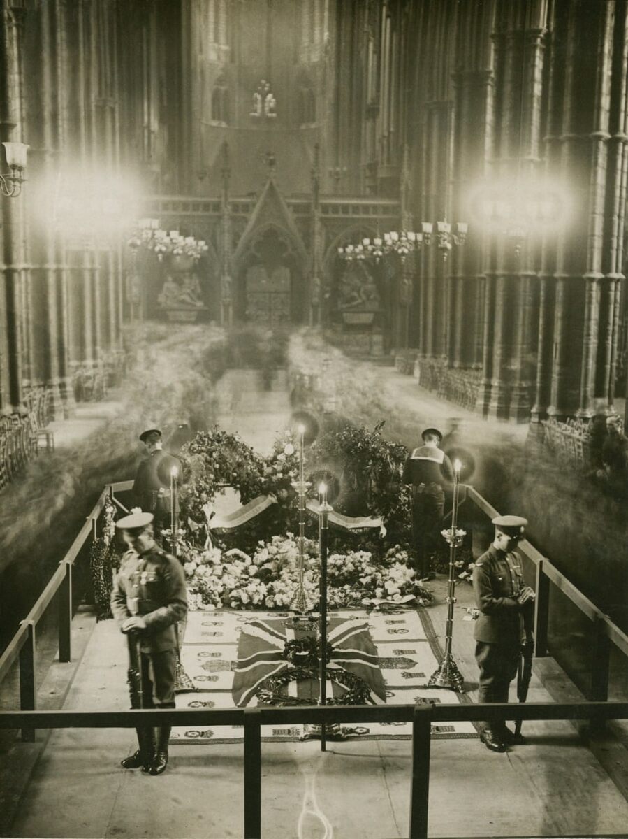 Похороны неизвестного британского солдата, 11 ноября 1920 год. Могила содержит прах неопознанного британского солдата. Он был захоронен 11 ноября 1920 года в Лондоне в Вестминстерском аббатстве, одновременно с погребением французского неизвестного солдата под Триумфальной аркой в Париже. Эти две могилы первыми увековечили честь павших в Первой мировой войне.