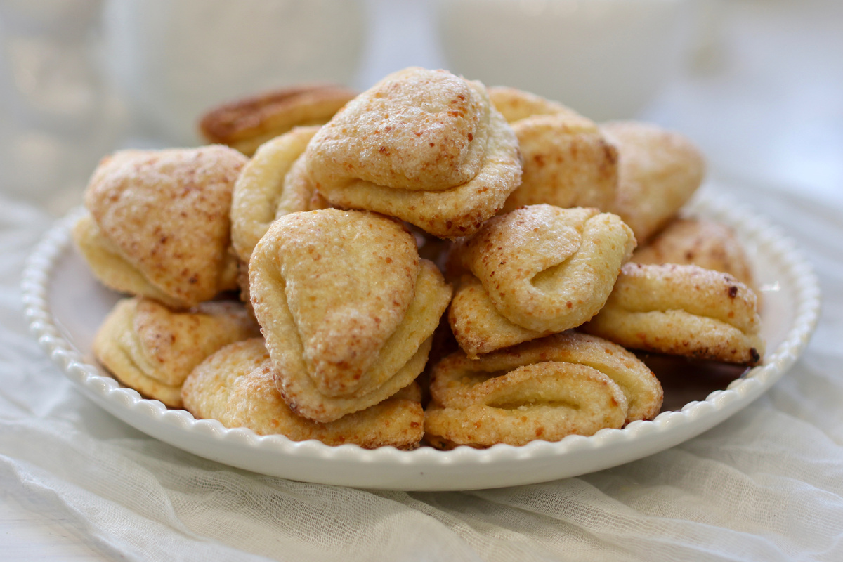 Каждый кружок обваливаем в сахаре, затем сворачиваем пополам. Снова обваливаем в сахаре и ещё раз сворачиваем — получится аккуратный «конвертик».