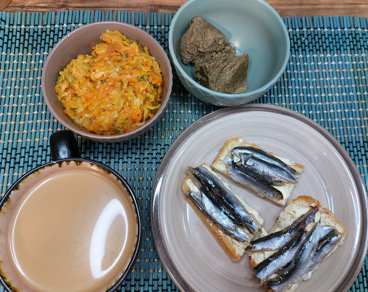 И решила, что из такого количества хамсы я сделаю бутерброды со сливочным маслом и хамсой. И у меня получилось шесть таких бутербродов, плюс икра из кабачка, который на огороде был замечен, и кофе с халвой на десерт. Чем не завтрак?