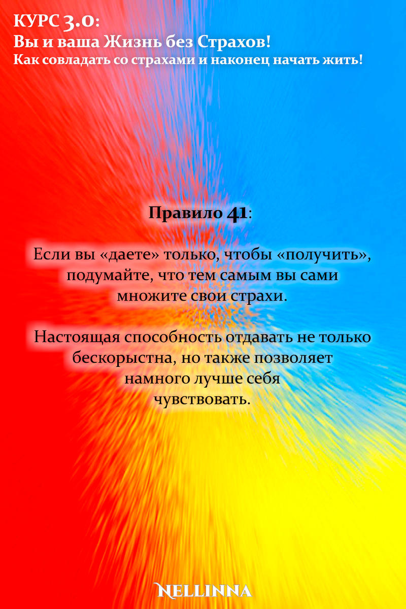 Продолжение - Принцип 41: Люди, которые боятся, не могут отдавать искренне, от чистого сердца, т.к. в них сидит глубоко укоренившееся чувство, что в этом мире «на всех точно не хватит». И один из важнейших уроков, который необходимо усвоить в жизни – это научиться отдавать, в этом и заключается ответ страху. Чтобы не пропустить следующую публикацию – Подписывайтесь! И делитесь полезной и бесплатной информацией! #курс #тренинг #обучение #практикум