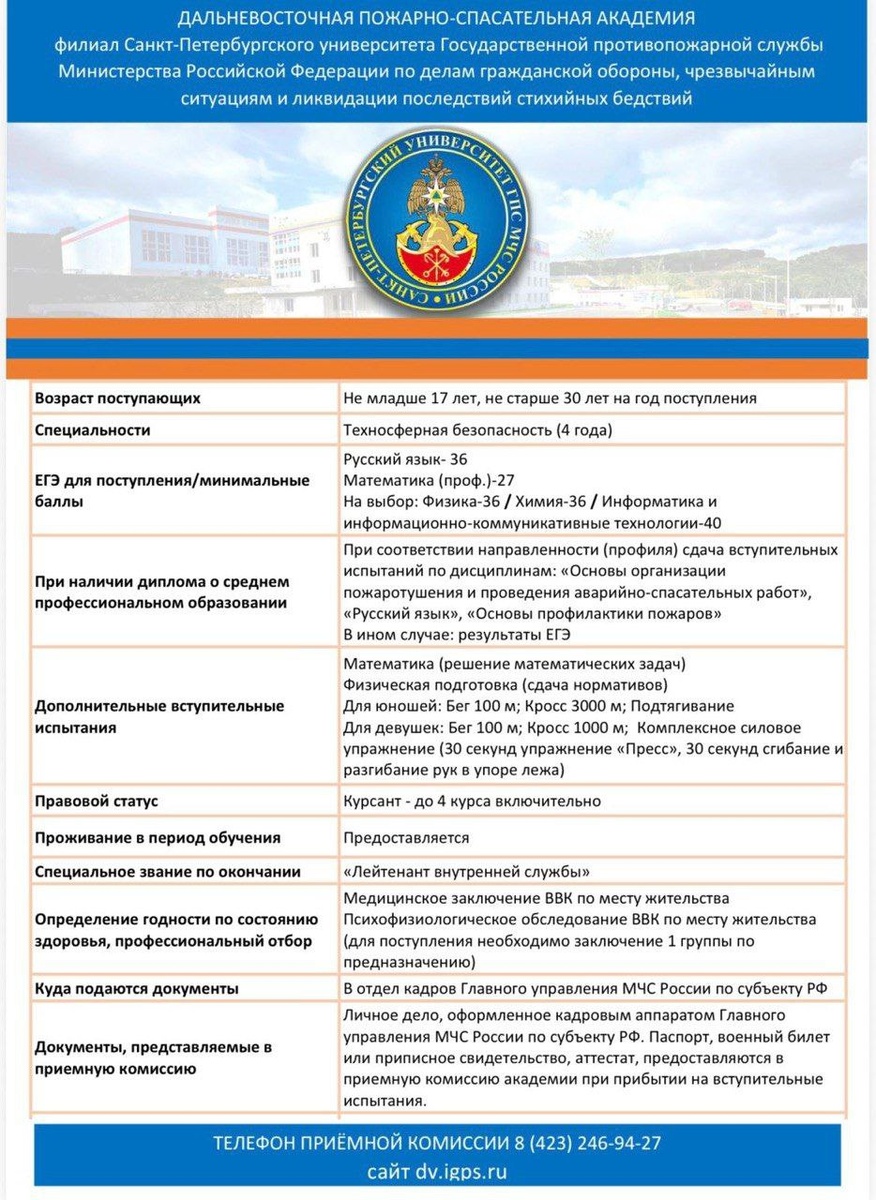 Внимание❗Информация для абитуриентов Главное управление МЧС России по Магаданской области объявляет набор кандидатов на обучение в образовательных организациях МЧС России. В 2026 году абитуриентам предлагается следующее высшее учебное заведение МЧС России (далее - ВУЗ): ✅ *Дальневосточная пожарно-спасательная академия - филиал Санкт-Петербургского университета ГПС МЧС России* (г. Владивосток , о.Русский): − специальность «Техносферная безопасность» (по профилю «Пожарная безопасность» ), срок обучения - 4 года (бакалавриат). Принимаются граждане Российской Федерации: ⚫ в возрасте от 17 до 30 лет; ⚫ имеющие образование не ниже среднего общего; ⚫несудимые; ⚫годные по состоянию здоровья 💪; ⚫успешно сдавшие вступительные экзамены. В период обучения курсанты обеспечиваются: • обмундированием; • питанием🍲; • жильем (общежитие)🏠; • денежным довольствием💰 ; • медицинским обслуживанием💊. Период обучения *засчитывается в стаж службы* (после зачисления в ВУЗ курсанту присвается