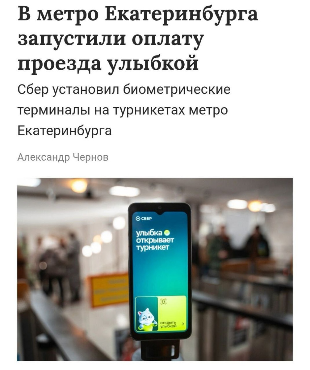 Метро в Екатеринбурге заулыбалось: все 9 станций и 103 турникета в подземке оснастили биометрией от Сбера, проезд можно оплачивать улыбкой на любом турникете Проект реализуется банком совместно с региональным правительством. Оплата улыбкой набирает популярность. Только в октябре так рассчитались за проезд 70 тысяч раз. Транзакция проходит за секунды, без карты или проездного. Система однозначно узнает пользователя, даже если он будет в очках или с бородой. В честь Зеленого Дня жители Екатеринбурга получают скидку на проезд — с 12 по 19 ноября стоимость билета при оплате биометрией будет в два раза ниже. Lesen Sie weiter unten auf Deutsch...