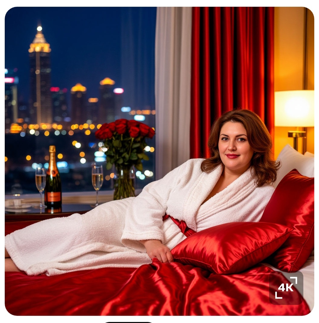 Лена с букетом в одной руке и чемоданом в другой прошла в комнату. Огромная кровать с красным постельный бельём, поразили женщину