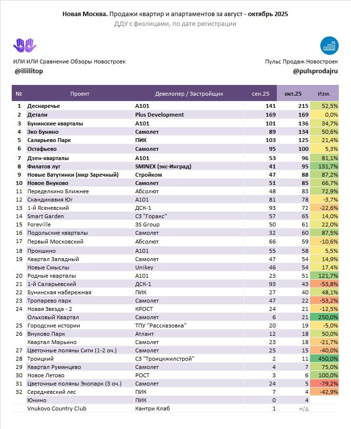 ⚡️Начнём раб. недельку со статы продаж Октября 2025 по новостройкам Новой Москвы #топжк ▪️Всего в НМ зарегили 2192 ДДУ. Или +21,2% к сентябрю ▪️Доля ипотечных 77% (+5 п.п.) ▪️Ср. цена квадратика на витрине шагнула за 300 тыр (311, или +4,5% к прошлому месяцу). А вот в сделках - средняя по палате не поменялась = порядка 280 тыр ▪️Золото и 215 ДДУ - уходят в жк Деснаречье (А101). Отгрузили на +53% больше и сместили со 2-го места жк Детали (Plus Development). В Деталях 169 ДДУ, ровно как в сент. На 3-ю строчку поднялись Бунинские кварталы (А101) = 136 ДДУ (+35%) ▪️Топ-3 застроев по спросу октября: А101, Самолет и ПИК. Вместе ребята собрали 61% покупантов заМКАДной Москвы... Кому в долях - то округлённо, соответственно: 29... 24... и 8% на брата Стату по старой Мск уже обрабатываем. Сегодня-завтра опубличу 👍 @iliilitop