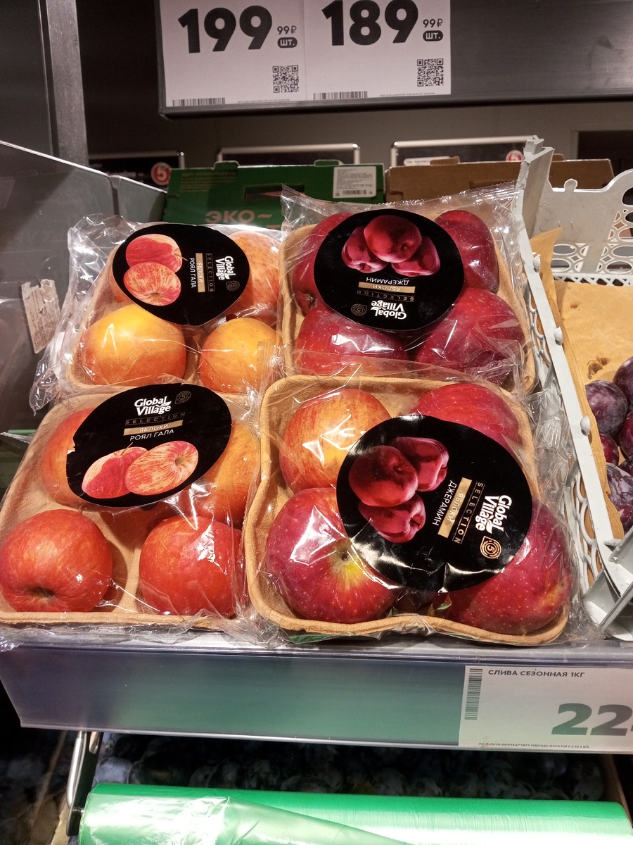 Вот, кстати, шикарные просто по виду яблоки, на них смотришь и думаешь - то ли картинка, то ли настоящие. Роял Гала мне знакомы, вижу их в каждом магазине, но вторые еще не встречались, хотя визуально они чем-то похожи. В упаковке 4 крупных яблока, каждое из них выглядит на все десять баллов, нет ни единого "дефекта", но что по вкусу - не знаю. Цена почти 200 рублей, что не так уж и дешево для фрукта, который обычно считают как раз бюджетным.