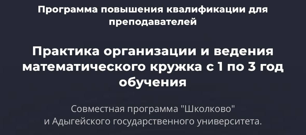Как интересно: Помочь педагогу открыть и вести математический кружок в лучших традициях российского образования предлагает Школково и Адыгейский государственный университет. Для педагогов программа полностью бесплатная. Все занятия проходят онлайн (за исключением практической работы с учениками). Чтобы получить доступ к материалам, начать обучение и посмотреть, как всё происходит, достаточно пройти регистрацию. Программа проходит каждые полгода и, при успешной аттестации вы получаете официальные документы на 120 или 36 часов в зависимости от выбранного потока. Подробности тут:https://3.shkolkovo.online/level-up