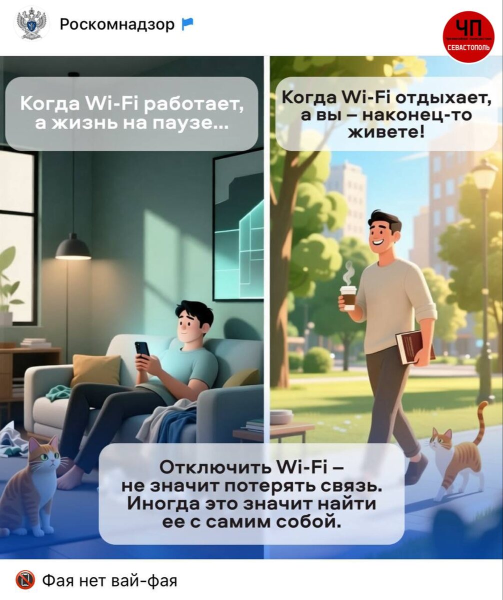 Роскомнадзор опубликовал изображение, демонстрирующее, что Wi-Fi ставит жизнь на паузу и иногда без него лучше "Отключить Wi-Fi — не значит потерять связь. Иногда это значит найти ее с самим собой" — гласит надпись ✈️Севастополь | Мы в MAX📲