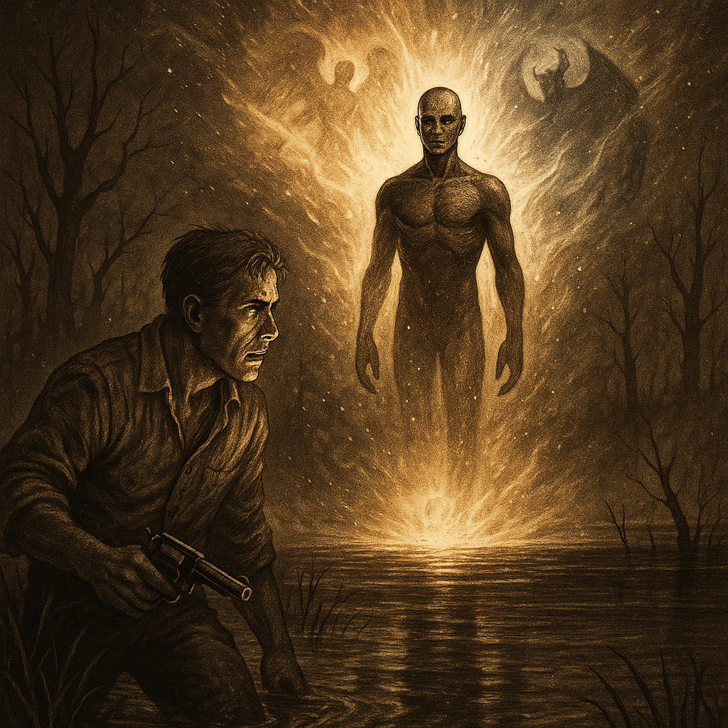 Вспышка была действительно яркой. Именно такой, какой Сергей представлял себе взрыв атомной бомбы, не совпадали только размеры. Ни ангела, ни чёрта уже не было. В воздухе пахло озоном и немного серой. Сергей допил чай, встал, потянулся. Соорудив, на всякий случай, из подручного материала шест, он с некоторой опаской ступил на хлипкое сооружение, именуемое "гать".